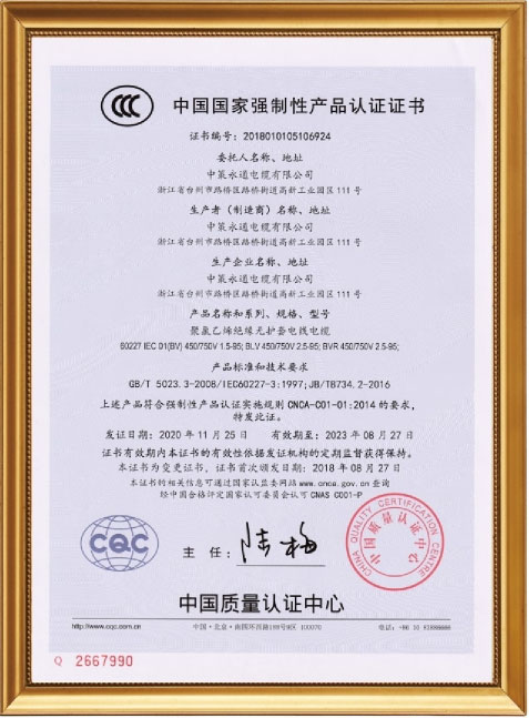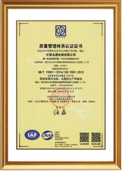 Zhongce Yongtong Cable Co., Ltd. was established in 2009, with a capital of 318.8 million yuan. It is a professional cable manufacturing enterprise integrating research and development, production, sales, and service. The company an area of 100 acres (130,000 square meters) and is located in the beautiful and wealthy coastal area of the East Sea - Taizhou. The company's main products include 110Kv ultra-high voltage cables; 26/35Kv,8.7/15Kv, 1.8/3Kv medium and high voltage power cables; fireproof cables, overhead stranded wires, insulated cables, environmentally friendly low-smoke halogen-free, flame retardant, fire-resistant copper, aluminum, and aluminum alloy power cables, high-temperature wires cables, silicone rubber cables, rubber-sheathed cables, shielded cables, computer cables, 0.6/1Kv and below low-voltage power and control cables, wires (BV, BVR, BVVB, BLV, RVV), etc. These products are widely used in energy, transportation,, communication, construction, railways, urban rail, automotive, aviation, metallurgy, petrochemicals, and many other fields. Since its establishment, the has always been oriented towards the high-end cable market demand, adhering to technological innovation, quality, and service as the foundation for the company's survival and development It takes meeting customer needs and leading industry development as a powerful driving force to achieve the grand vision of becoming a major supplier and service expert in comprehensive solutions in the cable industry. The company is one of the top 10 brands in the wire and cable industry in Zhejiang Province, one of the top 10 brands in the private wire and cable industry in China, and has received numerous honors such as National Specialized, Refined, and New Small Giant Enterprises, High-tech Enterprises, Provincial Science and Technology Small and Medium-sized Enterprises, Provincial Specialized, Refined, and New Small and Medium-sized Enterprises, District Government Quality, and Zhejiang Manufacturing "Pin" Word Mark Certification.